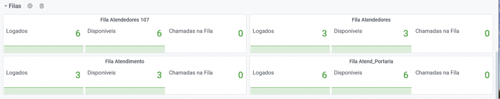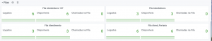 Painel com status de Filas – Visualização de todas as filas disponíveis no sistema, em cada fila é possível ver o nome da fila, quantidade de operadores logados na fila, quantidade de operadores disponíveis na fila e quantidade de chamadas na fila.