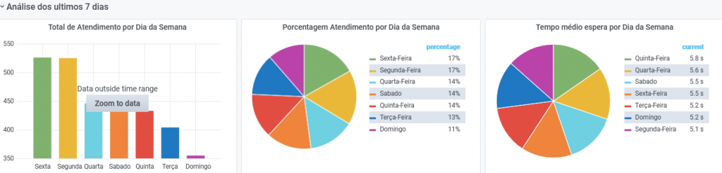 Tempo médio de Espera por dia da semana – Gráfico sinalizando o tempo médio de espera para atendimento por dia da semana em ordem decrescente, ou seja, dias com mais demora para atendimento primeiro e dias com atendimentos mais rápidos na sequencia. Indicador importante para alocação de pessoal nos dias com maior número de atendimento e sinalizados com maior tempo médio de espera.