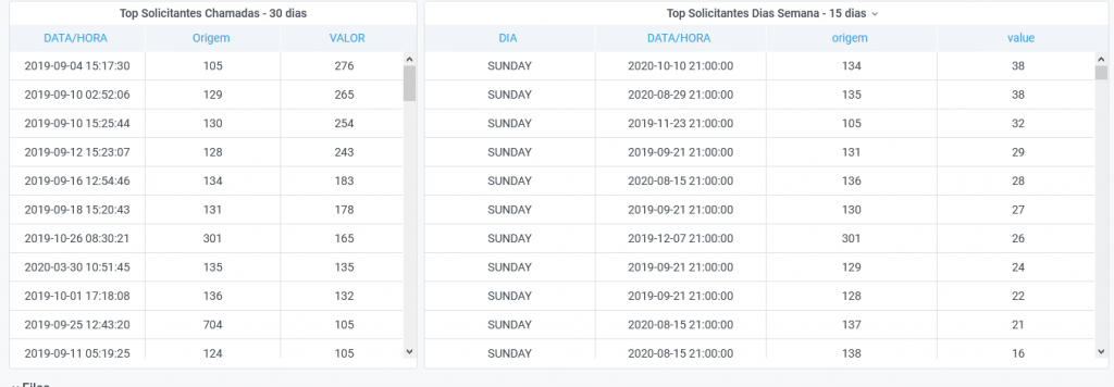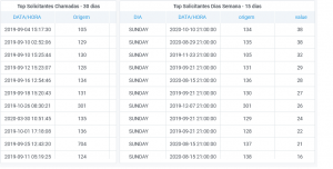 Top Solicitantes por dia da semana – Visualização da lista de clientes de forma agrupada pelo dia da semana e clientes que mais entraram em contato nos últimos 15 dias de forma decrescente, ou seja, do cliente que mais entrou em contato até o cliente que menos entrou em contato e em quais dias da semana eles mais solicitam atendimento. Listando o dia da semana, telefone de origem e número de vezes que entrou em contato. Indicativo importante para que a equipe técnica possa entrar em contato de forma pró ativa com os clientes listados para resolução definitiva das dúvidas e demandas recorrentes.