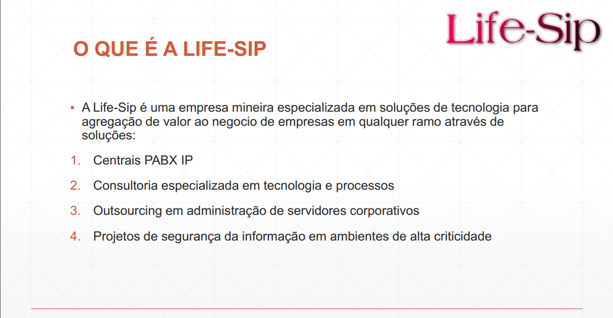 A Life-Sip conta com profissionais com mais de 10 anos de mercado de tecnologia, atuando na gestão de departamentos de tecnologia, infraestrutura e telecom com foco na gestão de resultados e estruturação de serviços críticos de alta disponibilidade.