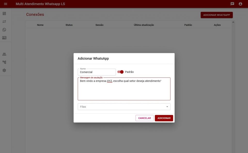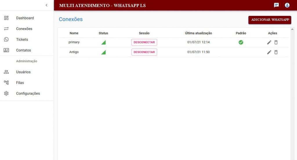 Conexões: Lista de Whatsapps conectados ao sistema, disponível inserção de Whatsapps para gestão centralizada, sinalizando ao sistema qual o Whatsapp padrão.