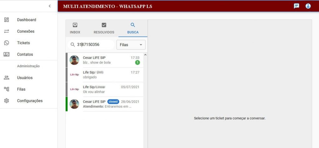 Visualização de tickets selecionados: Sistema busca as mensagens pelo número do contato ou mensagens com os contatos trazendo a lista de tickets que foram selecionados na busca.