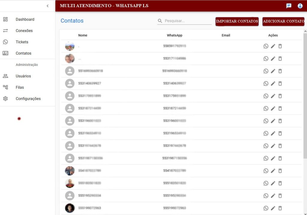 Importação ou adição manual de contatos: O sistema possui a funcionalidade de importação de todos os contatos dos Whatsapps conectados, ou seja, após a conexão de um Whatsapp ao clicar no botão “IMPORTAR CONTATOS” ele irá buscar e adicionar todos os contatos deste Whatsapp, incluindo fotos de perfil. Sendo possível também a adição manual do contato via formulário informando o número de Whatsapp do contato, o nome, e-mail de contato e alguma informação adicional sobre o contato.