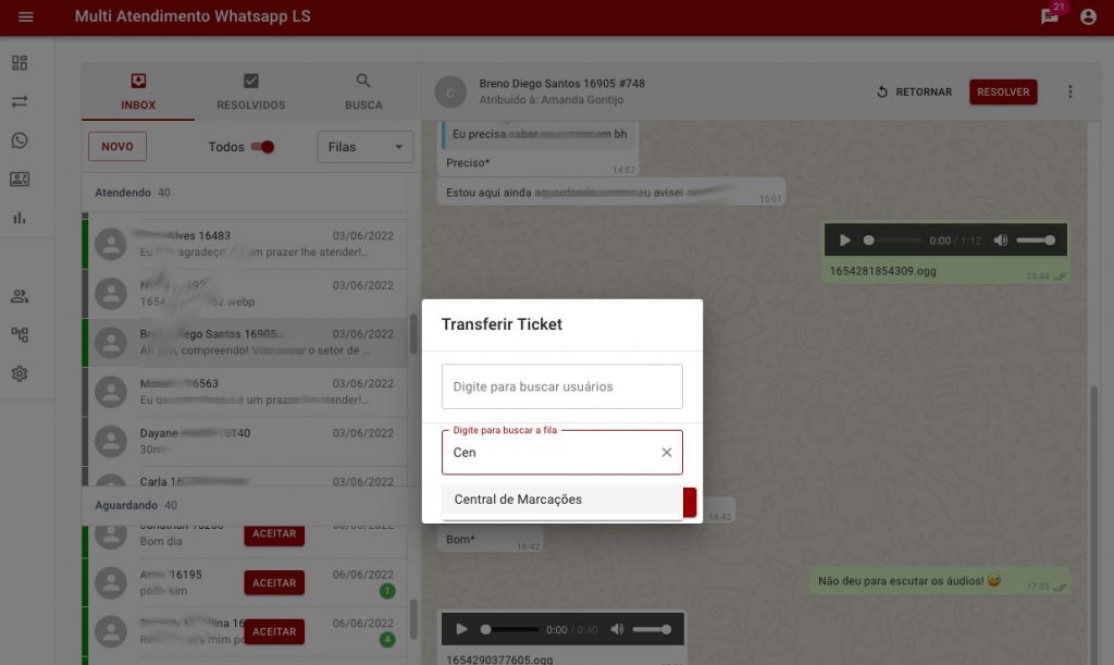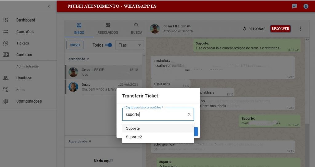 Transferência de Atendimento: Durante o atendimento o operador pode transferir aquele atendimento para outro operador disponível ou retorna-lo ao status de aguardando, fazendo assim com que o mesmo atendimento possa passar por vários setores da empresa em casos que seja necessário.
