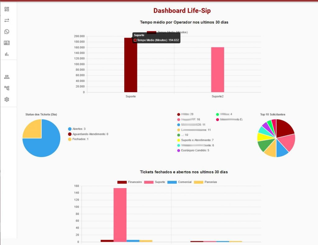 Visão Geral: A página de dashboard macro provê informações gerenciais sobre o atendimento do sistema para identificação e tomadas de decisão sobre o volume de atendimento, tempo e maiores solicitadores de suporte.