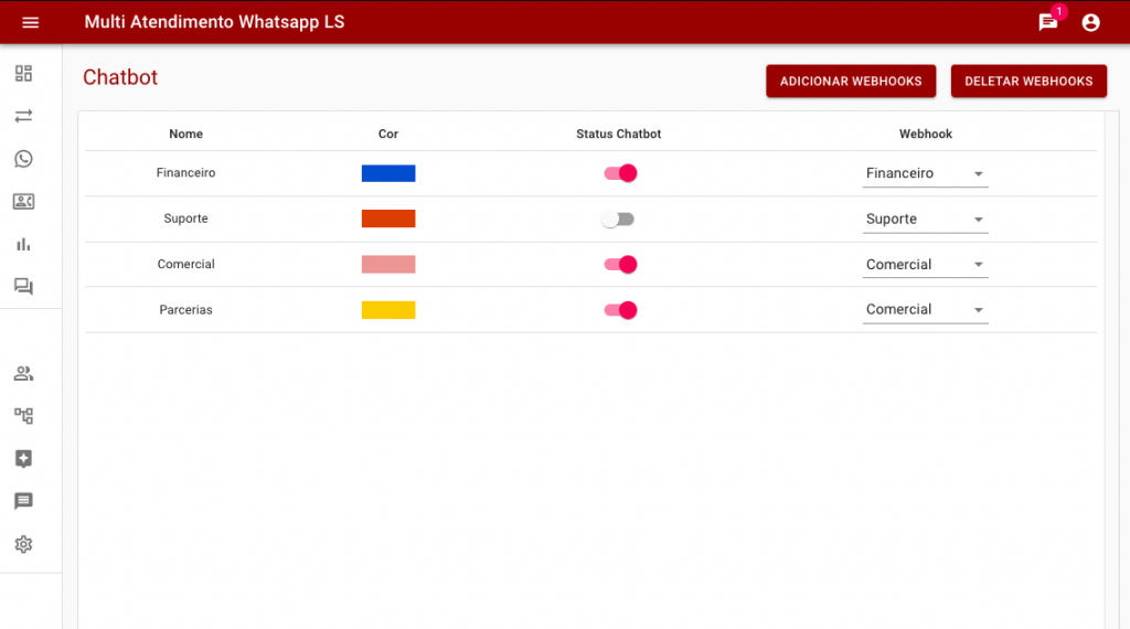 Conexão ao Bot para atendimento automático por fila: Pode ser ativado o bot de conversação especifico de cada fila, ou seja, são criadas estratégias de conversação independentes para captura de dados, suporte ou respostas de perguntas de acordo com o setor de atendimento – fila escolhido pelo cliente. Os bots podem ser ativados e desativados individualmente e pode ser escolhido na lista de hebhooks cadastrados qual vai responder pela fila, podendo ser o mesmo em várias filas.