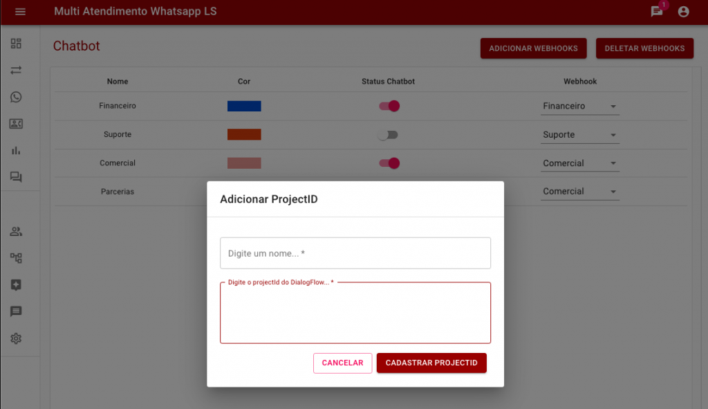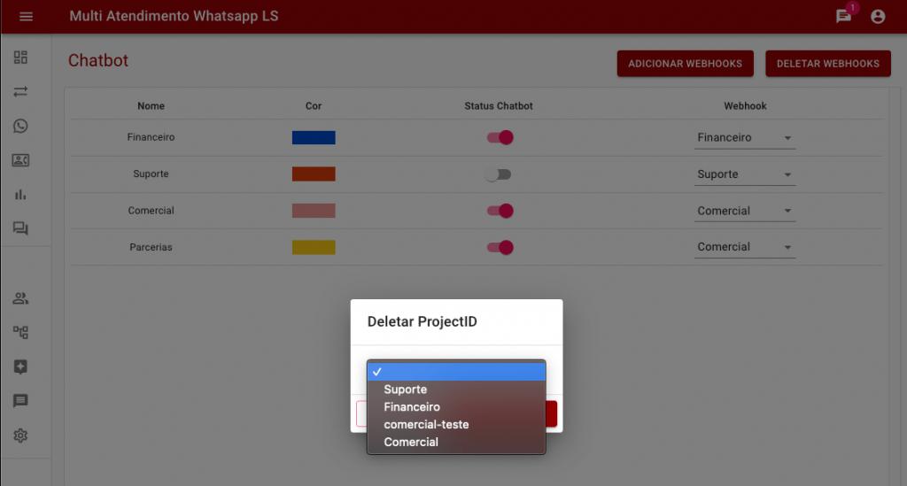 Deletar Webhooks e ProjectID: Formulário de deleção dos webhooks cadastrados, assim que o mesmo é deletado todas as filas que utilizam este webhook para gestão de conversação passarão a não serem vinculadas a nenhum webhook.
