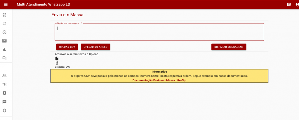 Em massa: Ao selecionar a caixa box de envio em massa o sistema irá exibir o botão para seleção do arquivo CSV contendo os contados para o qual a mensagem será enviada.