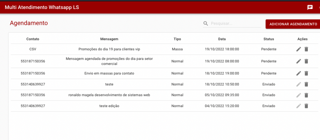 Botões de Ação: É possível editar as mensagens ainda não enviadas, caso seja uma mensagem em massa, inserindo novo arquivo CSV ou editando o texto a ser enviado. Além disto é possível deletar da lista de mensagens qualquer mensagem sendo ela enviada ou não.