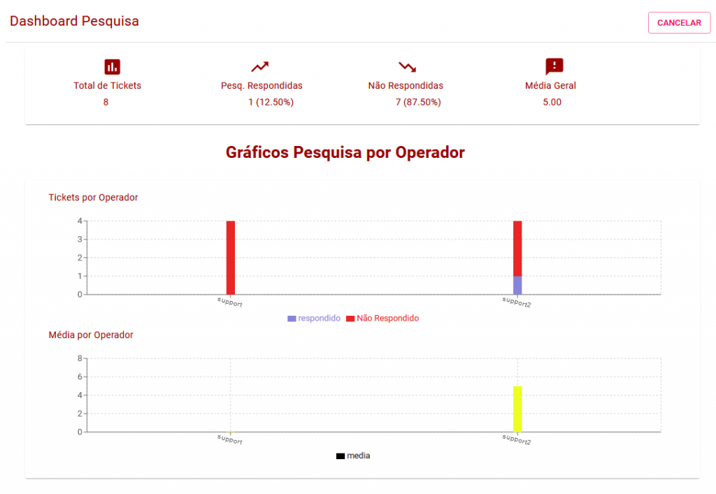 Tickets fechados e abertos: Este parâmetro mostra a quantidade de chamados abertos e fechados em cada fila de atendimento cadastrada no sistema no período indicado, é um indicador importante para identificação de “overload” em determinados setores do atendimento, podendo assim otimizar o atendimentos nestes setores.